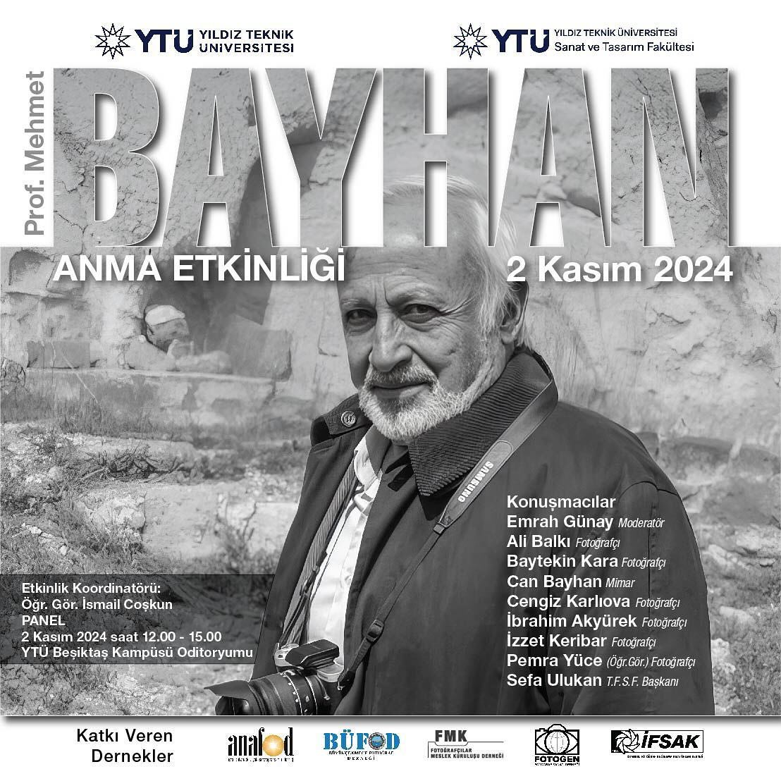 Geçtiğimiz yıl kaybettiğimiz Türk fotoğrafının değerli ismi Prof. Mehmet Bayhan’ın anısına Yıldız Teknik Üniversitesi Beşiktaş Kampüsü Oditoryumu’nda, anma etkinliği düzenlenecektir. Mehmet Bayhan’ın fotoğraf sanatına ve fotoğraf tarihimize kazandırdığı katkıları, panele katılan konusunda uzman konuşmacılar ile değerlendirilecek ve aktarılan bilgiler ile bir döneme ışık tutulacaktır.